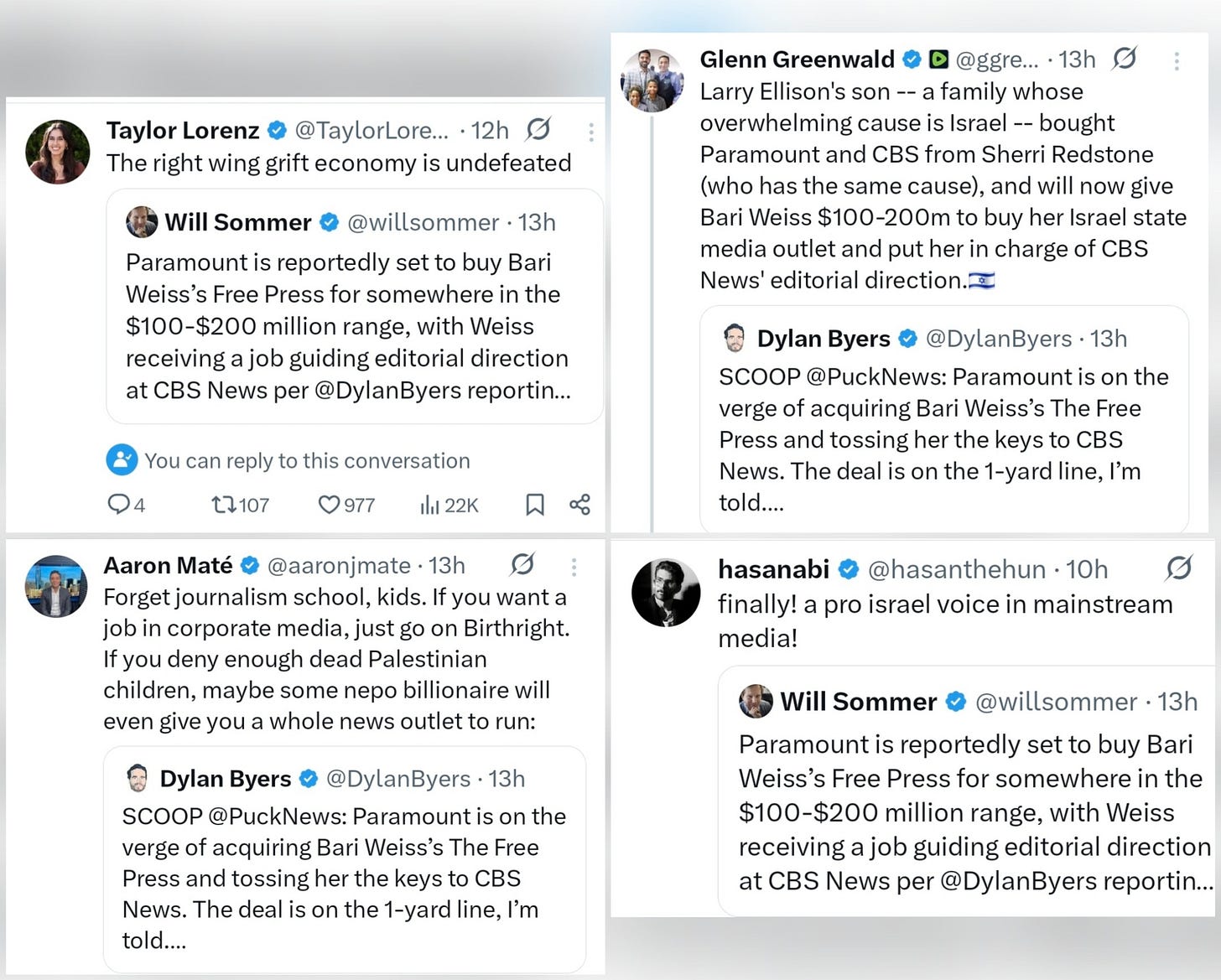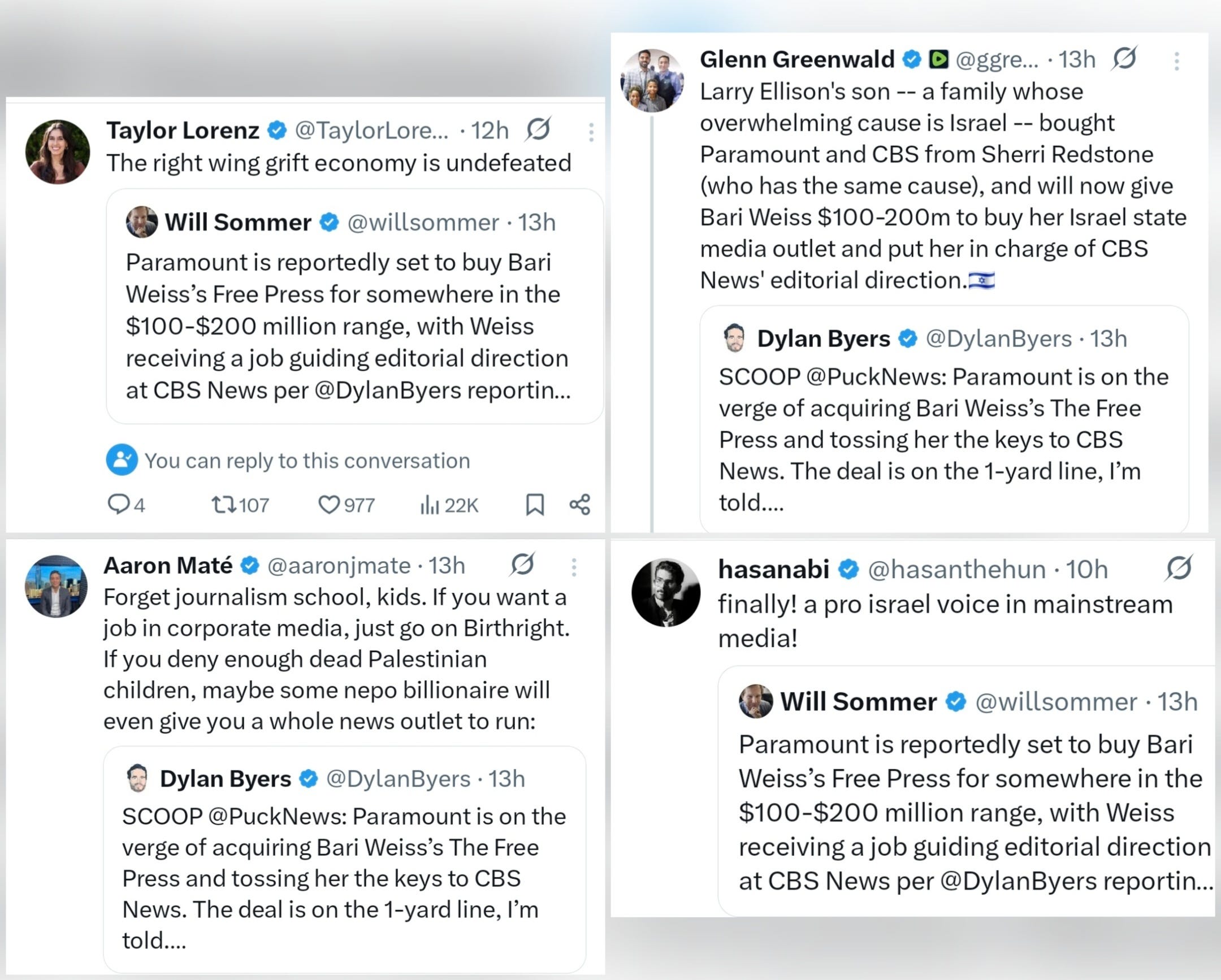 Now look at CBS. Reports say staffers are “apoplectic” over Weiss’s possible appointment, with some even threatening to resign.